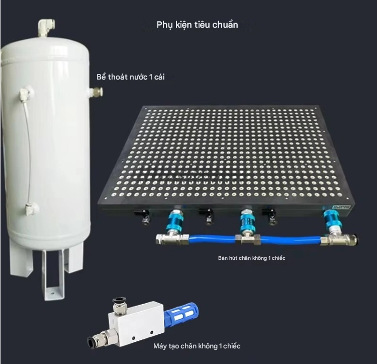 | Mô hình | Kích thước (mm) | Số lỗ hút | Đường kính lỗ | Lưu lượng khí | Áp suất | Công suất bơm | Phôi tối thiểu | Trọng lượng |