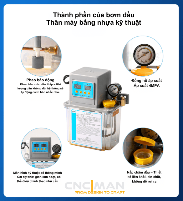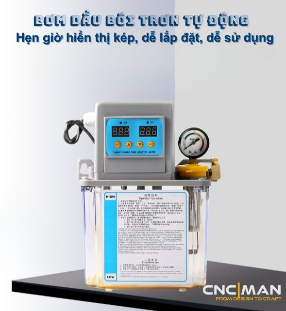Bơm dầu bôi trơn tự động là thiết bị không thể thiếu trong hệ thống máy CNC, giúp cung cấp dầu bôi trơn định kỳ cho các bộ phận chuyển động như vitme, ray trượt, bạc đạn, trục dẫn hướng, đảm bảo máy luôn vận hành êm ái, giảm hao mòn và tăng tuổi thọ.