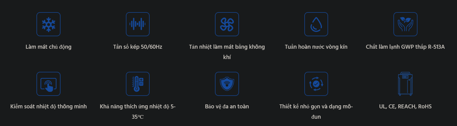 Làm mát máy khắc laser CO₂, máy CNC, máy đóng gói, máy hàn, và các thiết bị công nghiệp yêu cầu nhiệt độ ổn định.